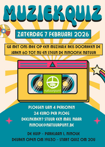 Inschrijven: geef een seintje via ninove@natuurpunt.be en schrijf 24 euro over op rekeningnummer BE17 9793 5295 5521 van Natuurpunt Ninove met vermelding Muziekquiz en ploegnaam.
